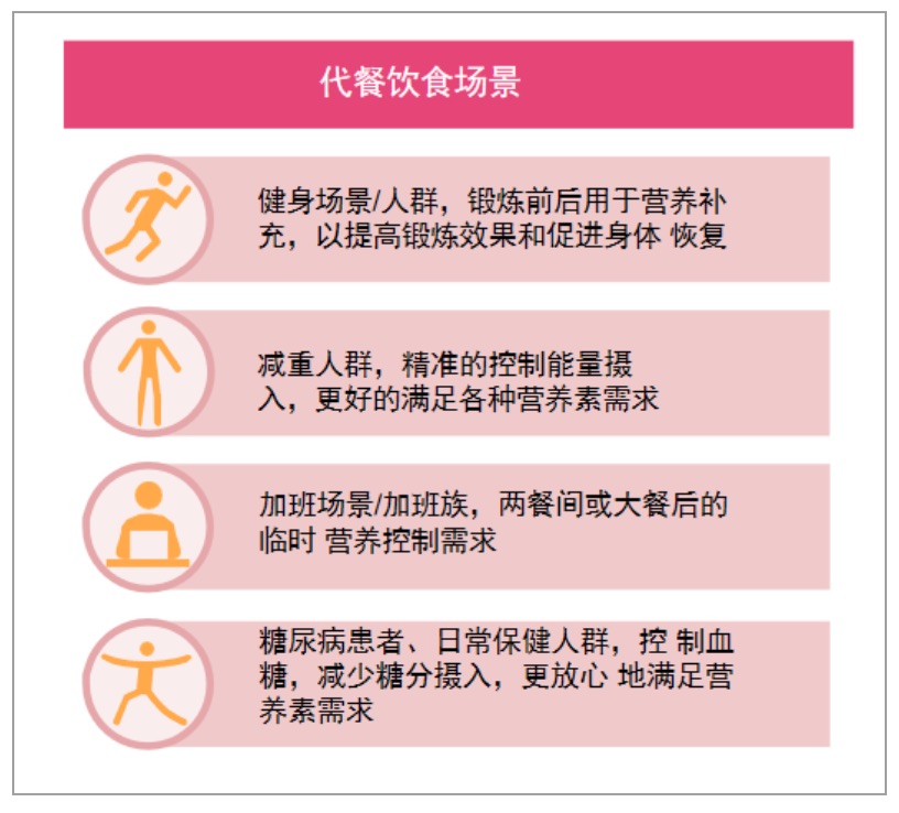 市場將根據(jù)不同的使用場景,進(jìn)行產(chǎn)品細(xì)分:以日常代餐、便捷飽腹為主要目的(如谷物、麥片、餅干零食等);以功能代餐、減肥塑身、抗糖代餐為主要目的(如代餐奶昔粉、斷糖食品等)。