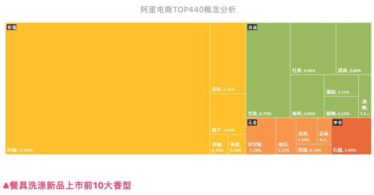 鑒于傳統(tǒng)餐具洗滌品的成分和香味單一特性,從線上數(shù)據(jù)可以推測(cè)出主流的香味/成分概念依舊是檸檬、生姜大類。