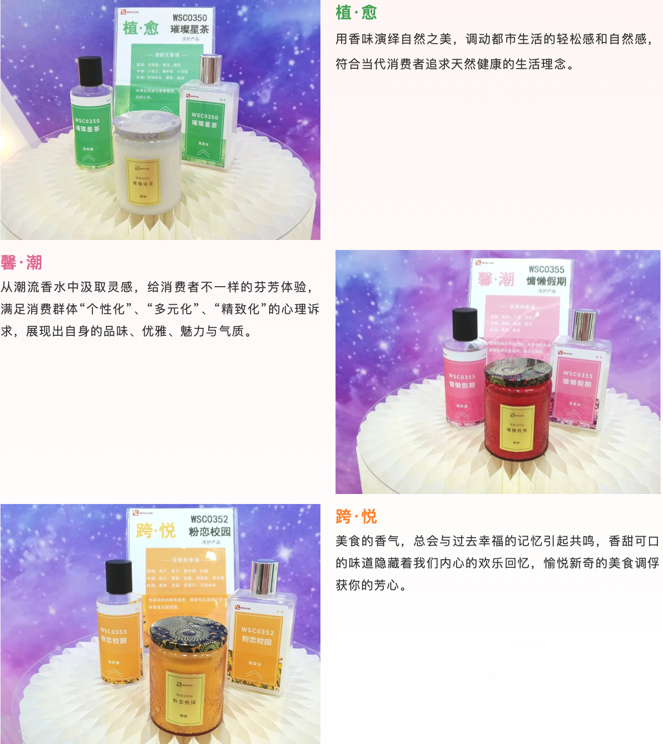 銘康結(jié)合當(dāng)前市場(chǎng)香氛趨勢(shì)和消費(fèi)者調(diào)研數(shù)據(jù),精準(zhǔn)挖掘品牌和用戶需求,為日化多品類產(chǎn)品提供健康、時(shí)尚、流行、有趣的香味解決方案?!爸病び?、“馨·潮”、“跨·悅”三大主題,讓客商將香氣、個(gè)性與使用場(chǎng)景相連接,豐富了對(duì)產(chǎn)品的實(shí)質(zhì)想象,具象化與產(chǎn)品的情感聯(lián)系。
